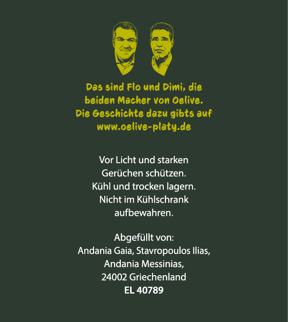 OELIVE ist im schonendsten Verfahren gepresst, so dass all die guten und gesunden Inhaltsstoffe noch vorhanden sind. Die Philosophie hinter OELIVE ist es den Erzeuger zu kennen und eine hohe Qualität zu produzieren. Wir verkaufen, was unsere Bäume liefern. So kommt es in der Regel dass das Öl irgendwann ausverkauft ist und die Kunden auf die neue Ernte warten müssen.